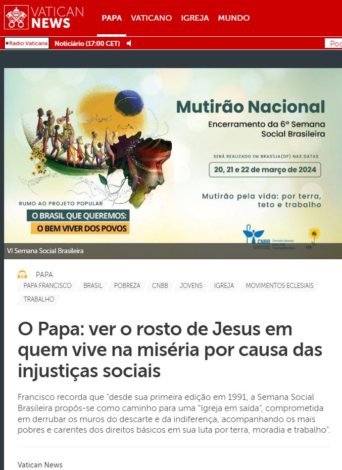 O Papa Francisco enviou uma carta, nesta quarta-feira (20/03), aos 150 participantes do Encontro Nacional de encerramento da 6ª Semana Social Brasileira. O encontro começa nesta quarta-feira, em Brasília, e prossegue até sexta-feira, 22. Aqui: https://www.vaticannews.va/pt/papa/news/2024-03/papa-carta-encerramento-vi-semana-social-brasileira-pobres.html