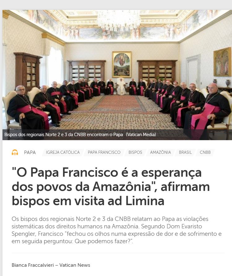 Os bispos dos regionais Norte 2 e 3 da CNBB relatam ao Papa as violações sistemáticas dos direitos humanos na Amazônia. Segundo Dom Evaristo Spengler, Francisco “fechou os olhos numa expressão de dor e de sofrimento e em seguida perguntou: Que podemos fazer?”. Ouça e compartilhe: https://www.vaticannews.va/pt/papa/news/2022-06/papa-francisco-esperanca-dos-povos-da-amazonia-bispos.html