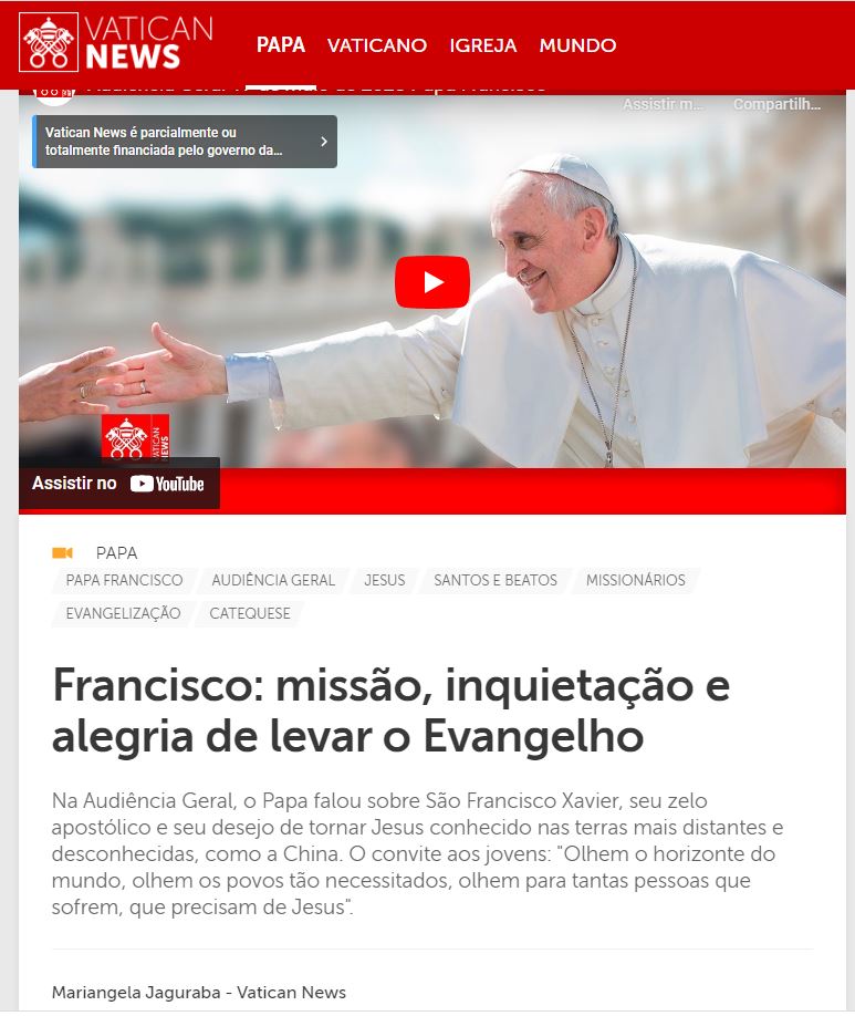 O Papa Francisco prosseguiu com o ciclo de catequeses sobre o zelo apostólico, na Audiência Geral desta quarta-feira (17/05), na Praça São Pedro, falando sobre a figura de São Francisco Xavier, “considerado, alguns dizem, o maior missionário dos tempos modernos”. Segundo o Papa, “não se pode dizer quem é o maior, quem é o menor. São tantos os missionários ocultos que hoje fazem muito mais do que São Francisco Xavier, considerado o padroeiro das missões, como Santa Teresa do Menino Jesus”.Ouça e compartilhe:https://www.vaticannews.va/pt/papa/news/2023-05/papa-francisco-audiencia-geral-francisco-xavier-zelo-evangelho.html