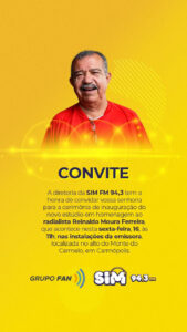 Rádio inaugurará novo estúdio com nome de Reinaldo Moura E o radialista, vereador, deputado estadual e conselheiro do TCE/SE, Reinaldo Moura será homenageado na próxima sexta-feira, 16, às 11h, com a inauguração do novo estúdio da rádio SIM FM 94,3 localizada no alto do Monte Castelo, em Carmópolis. Uma justa homenagem para um dos grandes nomes do rádio sergipano que, se vivo, teria completado 79 anos no último domingo, 11. A direção da SIM FM 94,3 e o ex-deputado André Moura em nome de toda família está fazendo o convite aos amigos e admiradores do eterno Reinaldo Moura.