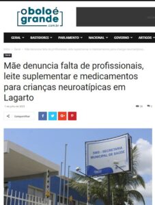 Mãe denuncia falta de profissionais, leite suplementar e medicamentos para crianças neuroatípicas em Lagarto Deu no site “O Bolo é Grande”:“Denúncia feita por uma mãe revela a persistente ausência de profissionais, oferta de leite suplementar e medicamentos para ansiedade destinados a crianças neuroatípicas no município de Lagarto. A denunciante enviou áudios ao radialista Aclécio Prata, que relatou os fatos durante o programa Sergipe em Destaque, 102.7 FM, na sexta-feira, dia 30.”