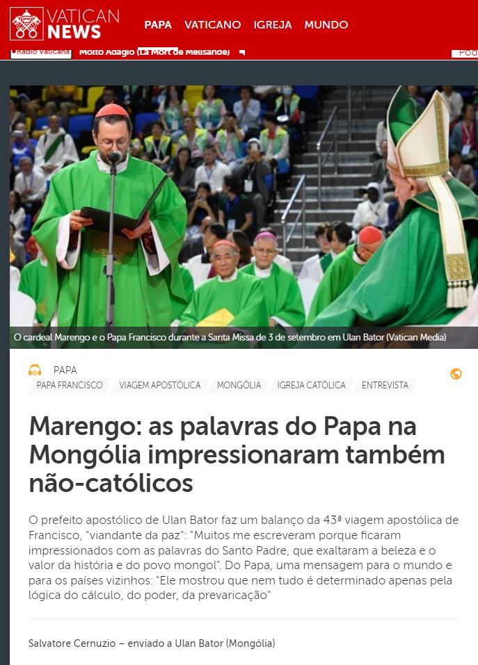 Ouça a entrevista ao cardeal Giorgio Marengo e compartilhe: https://www.vaticannews.va/pt/papa/news/2023-09/cardeal-marengo-entrevista-viagem-papa-francisco-mongolia.html