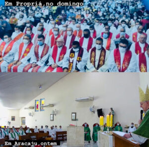 Clima fúnebre em Aracaju Já em Aracaju, ontem, na missa celebrada na igreja Jesus Ressuscitado, diferentemente do que ocorreu em Propriá, o que se viu foi uma igreja apática, morna, morta, envelhecida, distante do seu povo, desanimada, desesperançada, desmotivada, desnorteada, decepcionada, abatida, envergonhada, sem rumo, sem fé e distante do povo. Aliás, uma missa sem a participação do povo, do povo pobre. O clima não era de uma missa festiva por causa da presença do representante do papa, mas de uma missa fúnebre que retratou o desgaste de um bispo que desde 2017 tem causado sérios danos morais ao povo de Deus. Sem falar de um clero desanimado e intimidado por alguns que controlam a arquidiocese e de um arcebispo sem credibilidade, repetitivo, confuso e distante do clero e do povo pobre. Veja a imagem e tire sua conclusão.