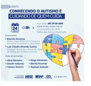 🧩 MPSE e grupo de mães e pais de autistas promoverão evento com o tema “Conhecendo o autismo e cuidando de quem cuida”. Aqui.