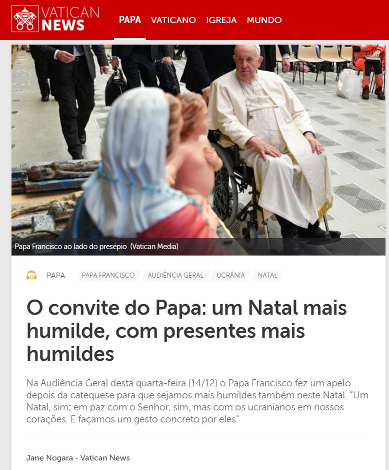 Nas saudações finais depois da catequese o Papa Francisco recordou a festa do Natal e o sofrimento da Ucrânia e pedindo a todos, um Natal sem ostentação, sem gastos excessivos, mais humano e com os ucranianos em nossos corações. Estas foram as suas palavras, ouça e compartilhe: