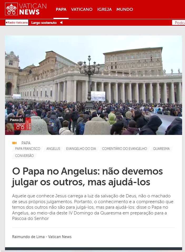 O olhar do Senhor sobre nós não é um farol ofuscante que nos ofusca e nos coloca em dificuldade, mas o brilho suave de uma lâmpada amiga, que nos ajuda a ver o bem em nós e a perceber o mal, para que possamos nos converter e ser curados com o apoio de sua graça. Foi o que disse o Papa no Angelus, ao meio-dia deste domingo, 10 de março, IV Domingo da Quaresma em preparação para a Páscoa do Senhor. Aqui: https://www.vaticannews.va/pt/papa/news/2024-03/papa-francisco-angelus-10-marco-2024-nao-julgar-mas-ajudar-outro.html