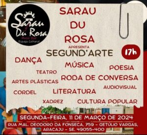 É hoje, 11: SEGUND`ARTE no Sarau do Rosa. Vale à pena conferir hoje, 11, a partir das 17h, na Rua Marechal Deodoro da Fonseca, 759, no Bairro Getúlio Vargas em Aracaju. Música, dança, poesia, teatro, audiovisual, artes plásticas, literatura, cordel, roda de conversa, xadrez e muito mais.