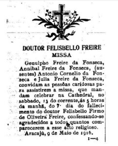 Líder da bancada de Sergipe na Câmara Federal, o deputado Felisbello Firmo de Oliveira Freire, falecera na madrugada de 8 de maio de 1916, no Rio de Janeiro, aos 58 anos de idade e seu enterro realizou-se às 9 horas do dia seguinte no cemitério São João Baptista. Para os sergipanos seu desaparecimento foi triste e lamentável acontecimento a desaparição dum vulto luminar como o do jornalista e historiador Felisbello Freire.