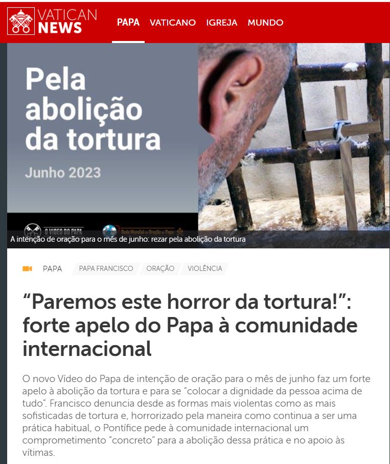Ouça a reportagem com a voz do Papa e compartilhe: https://www.vaticannews.va/pt/papa/news/2023-05/papa-francisco-intencao-oracao-junho-2023-abolicao-da-tortura.html