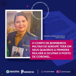 O Corpo de Bombeiros Militar de Sergipe terá em seus quadros a primeira mulher a ocupar o posto de coronel Do instagram da 𝖠𝗌𝗌𝗈𝖼𝗂𝖺𝖼̧𝖺̃𝗈 𝖨𝗇𝗍𝖾𝗀𝗋𝖺𝖽𝖺 𝖽𝖾 𝖬𝗎𝗅𝗁𝖾𝗋𝖾𝗌 𝖽𝖺 𝖲𝖾𝗀𝗎𝗋𝖺𝗇𝖼̧𝖺 𝖯𝗎́𝖻𝗅𝗂𝖼𝖺 𝖾𝗆 𝖲𝖾𝗋𝗀𝗂𝗉𝖾 – ASIMUSEP-SE ( https://www.instagram.com/asimusepse/ ) : A bombeira militar Maristela Xavier dos Santos entrou na corporação como cadete em 2001, atuou na Defesa Civil de Aracaju, foi comandante do 3º Grupamento de Bombeiros Militares (Itabaiana/SE), Diretora de Logística/Finanças do CBMSE e Assessora Técnica Institucional do CBMSE, dentre outras funções. A promoção é válida a partir de 21 de abril e foi publicada em diário oficial, na última sexta-feira, 14. A Asimusep se orgulha da trajetória da profissional e parabeniza a militar, a corporação desejando que essa seja a primeira de muitas mulheres a serem promovidas ao mais alto posto na instituição e que a partir dessa iniciativa do Governo do Estado se possa promover a equidade a partir do empoderamento das mulheres nas instituições de segurança pública.”