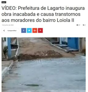 Prefeitura de Lagarto inaugura obra inacabada e causa transtornos aos moradores do bairro Loiola 2 Deu no “O Bolo é Grande”: “Uma pavimentação inacabada da Prefeitura de Lagarto está causando transtornos aos moradores do bairro Loiola 2. Mesmo sem estar completa, a obra foi inaugurada, deixando vários entulhos nas ruas da comunidade. Um jovem, morador da região, registrou o descaso através de vídeos compartilhados nos grupos de Whatsapp do Município.Em um dos vídeos, o rapaz cobra o posicionamento da prefeita Hilda Ribeiro.”A pergunta que eu quero fazer é pra prefeita. Como é que você inaugura uma obra inacabada? Porque para inaugurar, a gente tem que terminar, não é isso? A frente da minha casa vai ficar desse jeito? A casa dos outros moradores vai ficar desse jeito? Para piorar, deixaram um esgoto a céu aberto (…) Não sei se você vai me responder, assim como das outras vezes você não respondeu , mas eu gostaria de um pouco da sua compreensão”. Nas redes sociais de Hilda, o marketing apresenta outra realidade aos seus seguidores, porém, há quem mostre o que realmente acontece na “Lagarto Linda”- slogan publicitário da atual gestão. Veja os vídeos com a inauguração e a obra inacabada:https://www.oboloegrande.com.br/video-prefeitura-de-lagarto-inaugura-obra-inacabada-e-causa-transtornos-aos-moradores-do-bairro-loiola-ii/