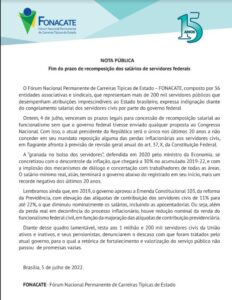 Em matéria ontem, 06, o jornal FSP mostrou que entidades representativas dos delegados, peritos e agentes federais publicaram nota conjunta na terça-feira (5) em repúdio a falas de Jair Bolsonaro (PL). Para elas, o presidente promove “descaso”, “abandono” e “menosprezo” aos integrantes das forças de segurança por sinalizar e não efetivar a reestruturação de carreiras, o que asseguraria ganhos salariais ao segmento que compõe a base de apoio a Bolsonaro. Toda matéria aqui.
