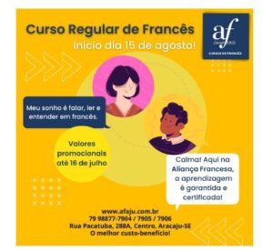 Matricule-se nos Cursos de Francês até 16 de julho com valores promocionais Os cursos de francês da Aliança Francesa estão com Matrículas Abertas, cujas aulas começam no dia 15 de agosto, para os cursos regulares e semi-intensivos, presencialmente ou online. Você escolhe! Matricule-se até o dia 16 de julho e usufrua dos valores promocionais. Para mais informações, acesse www.afaju.com.br/matriculas ou entre em contato pelos números 79 98877-7905 / 7904 / 7906. Fale conosco pelo WhatsApp e inscreva-se numa aula experimental para conhecer o nosso curso: