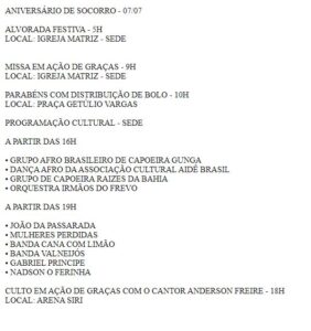 Programação Pela manhã, às 5h, acontecerá a alvorada festiva, na Igreja Matriz, na Sede de Socorro. Logo mais, às 9h, também na Igreja Matriz, será realizada uma missa em ação de graças pela emancipação política de Nossa Senhora do Socorro. Para continuar as festividades na Sede, a Secretaria Municipal de Cultura (Semcult) organizou uma programação com bandas, artistas e grupos culturais para movimentar os socorrenses a partir das 16h. Às 18h, na Arena Siri, com o apoio da Frente Parlamentar Evangélica da Câmara Municipal de Socorro, acontecerá um culto em Ação de Graças com o cantor Anderson Freire. Confira o cronograma completo das festividades do aniversário de Socorro no print ao lado.