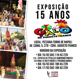 Abertura oficial A abertura oficial da exposição está marcada para às 11h do dia 15 de março, com a entrega do ‘Título de Comprometimento Cultural” as instituições e personalidades que sempre apoiaram o bloco. Durante o evento, será entregue uma carta aberta às autoridades municipais e estaduais, solicitando que o Bloco Galo do Augusto Franco seja oficialmente reconhecido e incluído no calendário turístico como uma prévia carnavalesca da cidade de Aracaju.