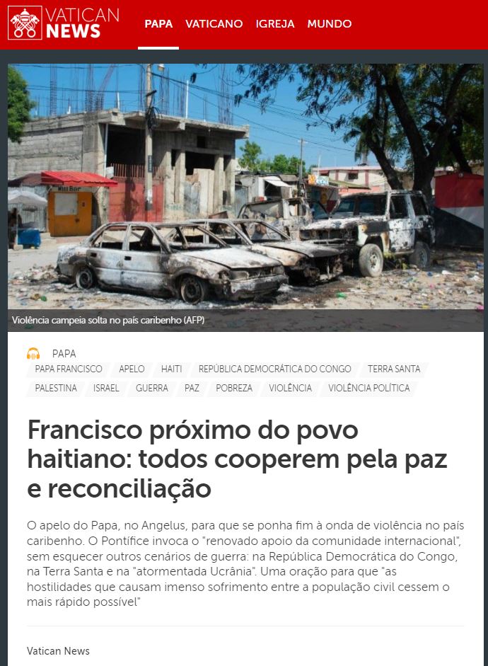 Após a oração mariana dominical da janela do Palácio Apostólico que dá para a Praça São Pedro, o Papa Francisco expressou sua “preocupação e tristeza com a grave crise que afeta o Haiti e os episódios violentos que ocorreram nos últimos dias” e se disse próximo da Igreja e do “querido povo” que vem sofrendo há anos. Aqui toda matéria:
