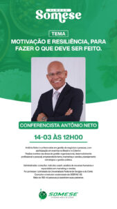 Com o tema “ Motivação e Resiliência, para fazer o que deve ser feito”, o conferencista Antônio Neto, participará do almoço SOMESE na próxima quinta-feira, 14, a partir das 14h, na sede da entidade. O serviço para quem desejar participar: Valor: R$ 65,00 (Prato principal, refrigerante ou água, vinho, sobremesa e café).Confirmar presença com antecedência através do telefone ou WhatsApp pois o restaurante que nos atende não funciona em nossa sede. Assim para que não haja atraso nos pratos receberemos os pedidos até as 11h da data do almoço. Pedimos a compreensão de todos.: A solicitação do prato, mesmo que o solicitante não compareça, implica em seu pagamento. (79) 98815-0525 /WhatsApp (Confirmar presença).