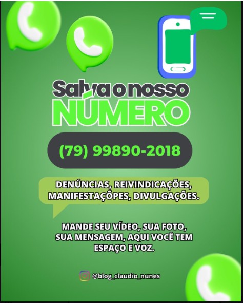 PELO ZAP DO BLOG CLÁUDIO NUNES – Quem desejar receber o link do blog logo cedo, pela manhã, pelas listas de transmissões é só enviar o pedido pelo celular do Blog: 79 99890 – 2018 (tb p/ enviar material p/ divulgação e denúncias).