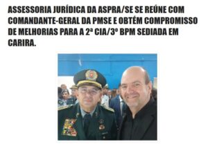 Do Blog Espaço Militar: A assessoria jurídica da ASPRA/SE (Associação de Praças Policiais e Bombeiros Militares de Sergipe), através do advogado Márlio Damasceno, se reuniu com o Coronel Alexsandro Ribeiro, Comandante-Geral da Polícia Militar do Estado de Sergipe, cobrando melhorias para a 2ª CIA/3º BPM, sediada em Carira, que é um prédio bastante antigo e com precárias condições de trabalho. O Coronel Ribeiro assumiu o compromisso de implementar melhorias para a citada unidade militar, determinando de imediato que o setor competente da PMSE adotasse providências para os problemas apresentados. A assessoria jurídica da ASPRA/SE mais uma vez agradece ao Coronel Ribeiro pela atenção dispensada e estará acompanhando as medidas que serão tomadas para dar melhores condições de trabalho aos policiais militares que labutam na 2ª CIA/3º BPM. ASPRA/SE, sempre na luta por melhorias para a classe militar.