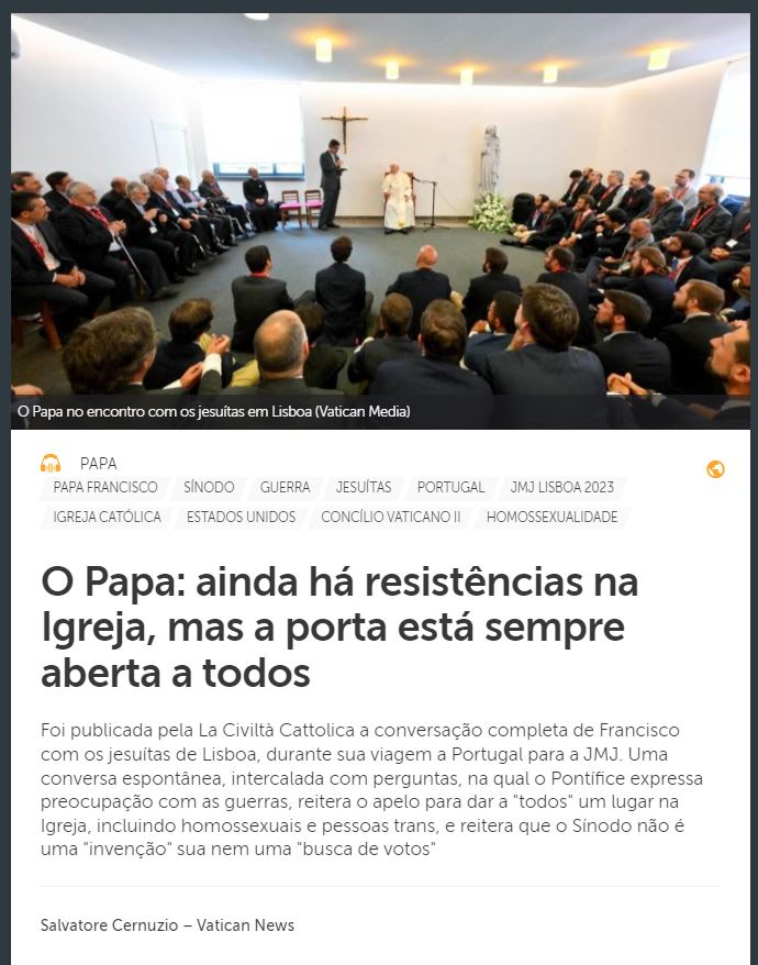 “Todos, todos, todos”. O apelo lançado e relançado ao longo da JMJ de Lisboa por uma Igreja acolhedora, onde haja espaço para “todos, todos, todos”, incluindo pessoas homossexuais e transexuais, o Papa Francisco reiterou e aprofundou em sua conversa com os jesuítas de Portugal. O Papa se reuniu com seus confrades em 5 de agosto no Colégio de São João de Brito, uma escola dirigida pela Companhia de Jesus, durante sua viagem à capital lusitana para a Jornada Mundial da Juventude. Ouça e compartilhe:
