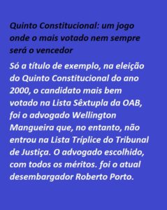 Só a título de exemplo, na eleição do Quinto Constitucional do ano 2000, o candidato mais bem votado na Lista Sêxtupla da OAB, foi o advogado Wellington Mangueira que, no entanto, não entrou na Lista Tríplice do Tribunal de Justiça. O advogado escolhido, com todos os méritos. foi o atual desembargador Roberto Porto.