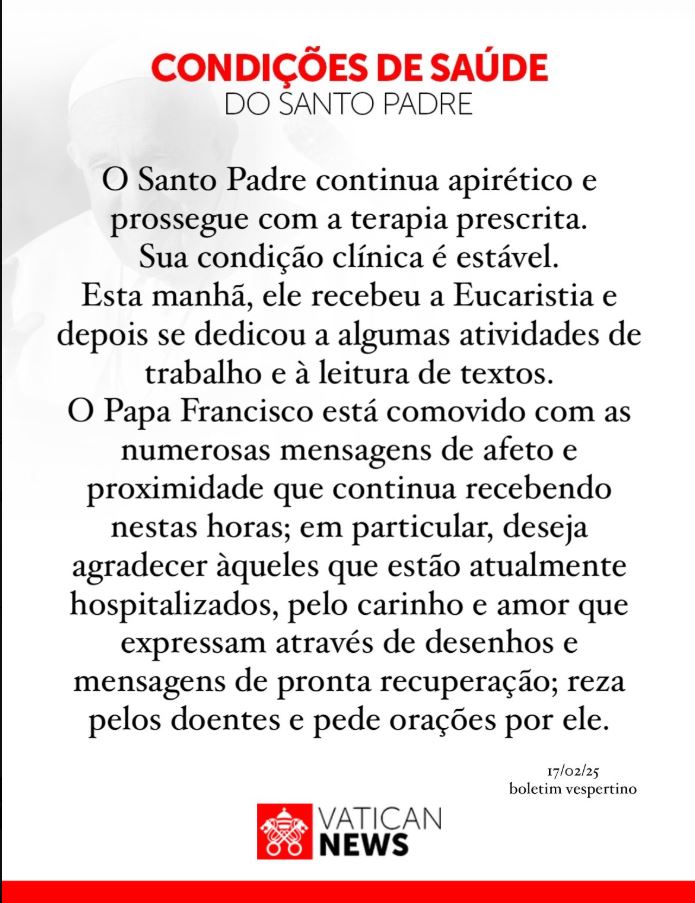 A humanidade precisa que a figura carismática do Papa Francisco continue viva,pois não se cansa de proclamar o fim da guerra,do ódio e anunciar a força do amor entre todos,a paz e a amizade social.É um dos faróis a nos orientar para um fim bom para a humanidade. Deus o conserve.