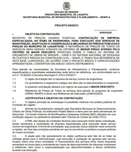 Critério de menor preço Pelo edital, a referência de preços de todos os serviços será gerado através do critério de menor preço aferido pelo critério de maior desconto ofertado sobre a tabela do Sistema de Orçamento de Obras de Sergipe – ORSE e do Sistema Nacional de Pesquisas de Custos e Índices da Construção Civil – SINAPI, e tendo sua referência de data base (junho/2023), de acordo com o projeto básico e especificações apresentadas, convertido em anexo I deste instrumento. O projeto básico tem 23 páginas ( PROJETO BÁSICO), assim como todo o edital aqui.