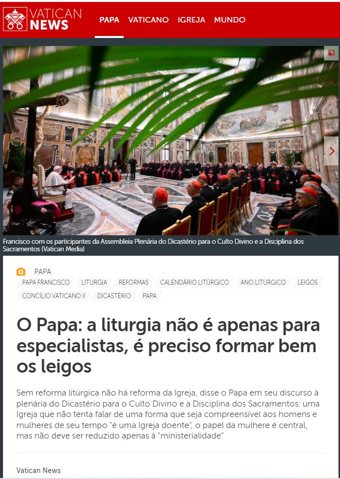 Em seu discurso à Assembleia Plenária do Dicastério para o Culto Divino e a Disciplina dos Sacramentos, cujos participantes foram recebidos pelo Papa na manhã desta quinta-feira, 8 de fevereiro, na Sala Clementina, no Vaticano, Francisco usou palavras contundentes para enfatizar que “sem reforma litúrgica não há reforma da Igreja”. Aqui: