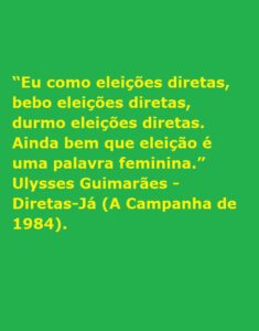 “Eu como eleições diretas, bebo eleições diretas, durmo eleições diretas. Ainda bem que eleição é uma palavra feminina.” Ulysses Guimarães – Diretas-Já (A Campanha de 1984).