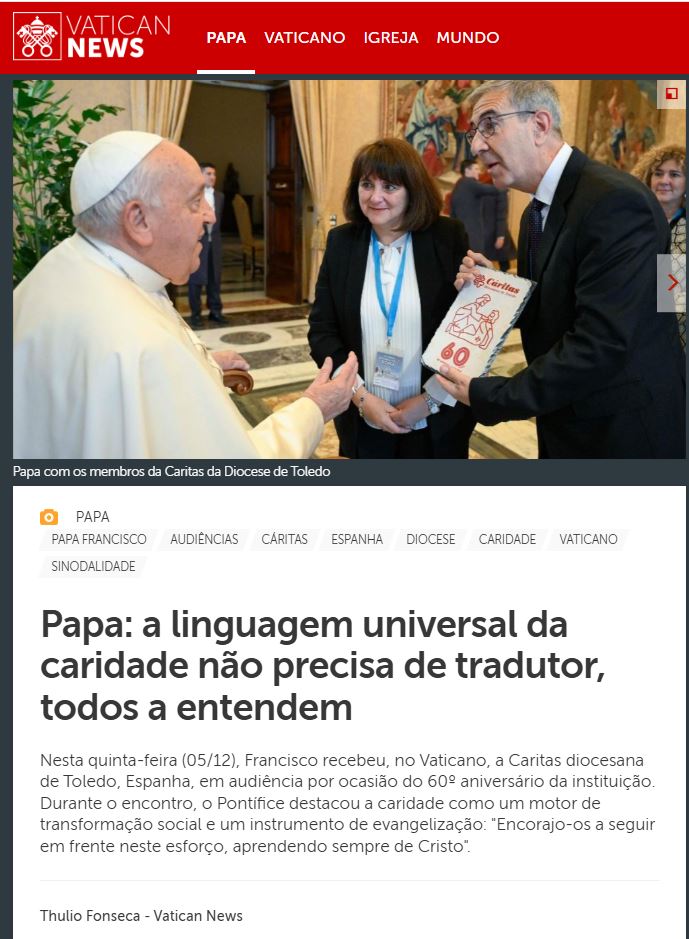 Ouça com a voz do Papa e compartilhe: https://www.vaticannews.va/pt/papa/news/2024-12/papa-caritas-toledo-audiencia-05-12-2024.html
