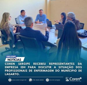 Coren-SE recebeu representantes da empresa IDH para discutir a situação dos profissionais de enfermagem do município de Lagarto Por Coren-SE: Na última quarta-feira, 4, o Conselho Regional de Enfermagem de Sergipe (Coren-SE) se reuniu com representantes da empresa IDH, responsável pela prestação de serviços de saúde em Lagarto. O principal tópico discutido foi a grave situação dos profissionais de enfermagem que foram demitidos. A empresa alegou uma dívida superior a 3 milhões de reais devido à falta de repasses por parte da prefeitura municipal Lagarto. Essa inadimplência provocou uma crise financeira e impactou diretamente nos pagamentos aos profissionais de enfermagem, gerando preocupação e insegurança na categoria.