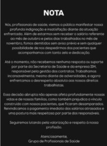 Sem resposta E continua a matéria: A nota também critica a falta de resposta da Secretaria de Saúde de Lagarto e da empresa IDH, responsável pela gestão dos contratos, classificando a situação como um “desrespeito aos direitos trabalhistas”. Os profissionais ressaltam que o impacto das demissões vai além da categoria, prejudicando tanto suas famílias quanto os pacientes que ficaram sem assistência.
