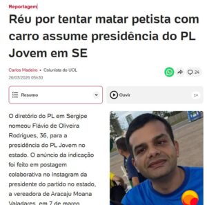 Imprensa nacional registra nomeação de Flávio de Oliveira Rodrigues, 36, para a presidência do PL Jovem no estado: “Réu por tentar matar petista com carro assume presidência do PL Jovem em SE”. leia parte da matéria da UOL:
