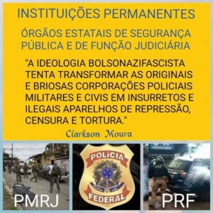 O ATUAL (DES)GOVERNO FEDERAL TEM PROCURADO EFETIVAR, PAULATINA E OSTENSIVAMENTE — AO DELIBERADO E TOTALITÁRIO ARREPIO DA CONSTITUIÇÃO DA REPÚBLICA FEDERATIVA DO BRASIL, FORMADA PELA UNIÃO INDISSOLÚVEL DOS ESTADOS, MUNICÍPIOS E DO DISTRITO FEDERAL, CONSISTENTE EM “ESTADO DEMOCRÁTICO DE DIREITO” — A DISFUNCIONALIDADE INSTITUCIONAL DAS “FORÇAS ARMADAS” E AS “CORPORAÇÕES POLICIAIS”, MILITARES E JUDICÁRIAS, FEDERAIS E ESTADUAIS — INSTITUIÇÕES ESTATAIS PERMENTES E APOLÍTICAS, DE MATRIZ ORIGINARIAMENTE CONSTITUCIONAL (arts. 142, 143 e 144, da CF/88) — CONFUNDINDO-AS COM GOVERNATIVOS E PERÍÓDICOS APARELHOS DE INTIMIDAÇÃO, REPRESSÃO, CENSURA E, ATÉ MESMO, DE TORTURA, DISPONÍVEIAS À ARBITRARIEDADE HEGEMÔNICO-POLÍTICA DA CONJUNTURA CORRESPONDENTE, COM VISTAS AO PRETENDIDO E EXEQUÍVEL “GOLPE MILITAR”.