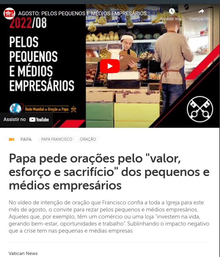 Foi divulgado o Vídeo do Papa com as intenções de Oração para agosto, confiado por Francisco à Igreja Católica através da Rede Mundial de Oração do Papa. Este mês, o Santo Padre reza “para que os pequenos e médios empresários, duramente atingidos pela crise econômica e social, possam encontrar os meios necessários para continuar suas atividades a serviço das comunidades em que vivem”. Ouça e compartilhe: