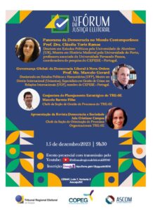 Vem aí o XI Fórum da Justiça Eleitoral! No dia 15 de dezembro de 2023, o Tribunal Regional Eleitoral de Sergipe (TRE-SE) promoverá o XI Fórum da Justiça Eleitoral. O evento acontecerá presencialmente, a partir das 9h30, no auditório anexo do edifício-sede. As inscrições são gratuitas e podem ser realizadas por meio do seguinte link (para quem deseja receber o certificado do evento): Inscrição – XI Fórum da Justiça Eleitoral.