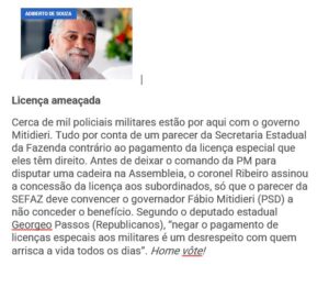 O colega jornalista Adiberto de Souza – aqui na Infonet (print acima) – informou ontem, 28, que a Secretaria de Estado da Fazenda – Sefaz, negou o pagamento da licença especial de mais de mil militares.