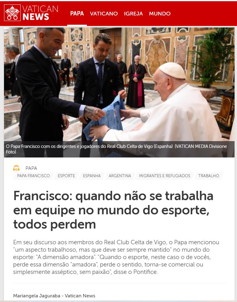 Ouça e compartilhe: https://www.vaticannews.va/pt/papa/news/2023-07/papa-francisco-real-club-celta-de-vigo-esporte-trabalho-equipe.html