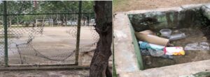 Quadra de esportes com cerca de proteção totalmente destruída em vários lugares. Lixo acumulado e até com recipientes de plásticos com água que pode ajudar na proliferação de mosquitos aedes aegypti.