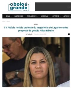 Sem respeito E finaliza a matéria: “A ex-secretária Luiza Ribeiro, que é tia do deputado Gustinho Ribeiro, esposo da prefeita, compartilhou um vídeo, no qual diz que a gestão não respeita o direito dos professores. Vale ressaltar, que a prefeita não estava na prefeitura no momento do protesto, algo que não é novidade para quem a procura, e também não participa das reuniões de negociação com o magistério.” O vídeo aqui: https://www.oboloegrande.com.br/tv-atalaia-noticia-protesto-do-magisterio-de-lagarto-contra-proposta-da-gestao-hilda-ribeiro/