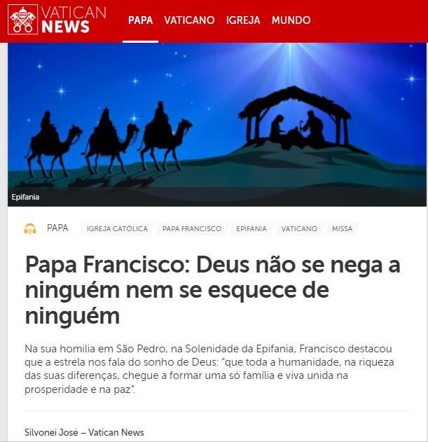 Francisco destacou nas suas palavras que os Magos testemunham que se puseram a caminho e realizaram uma mudança nas suas vidas, porque viram uma nova luz no céu. Enquanto celebramos a Epifania do Senhor no Jubileu da Esperança – disse o Santo Padre -, podemos deter-nos a refletir sobre esta imagem. Então destacou três caraterísticas da estrela de que nos fala o evangelista Mateus: é brilhante, visível para todos e indica um caminho. Aqui: https://www.vaticannews.va/pt/papa/news/2025-01/papa-francisco-deus-nao-nega-ninguem-esquece-epifania.html