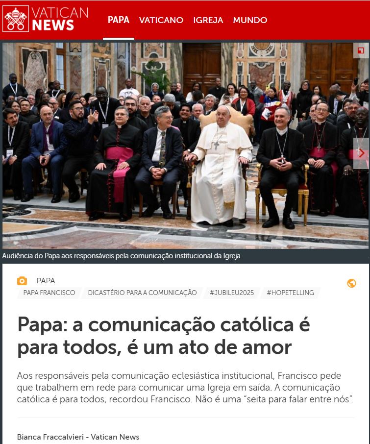 No encerramento do Jubileu dos Comunicadores, o Papa recebeu na manhã desta segunda-feira os presidentes das Comissões Episcopais da Comunicação e assessores de imprensa das Conferências Episcopais. Mais do que indicações, o discurso do Papa foi um convite a um exame de consciência através de vários interrogativos para refletir sobre como a Igreja comunica atualmente. Leia e Ouça a reportagem completa aqui: https://www.vaticannews.va/pt/papa/news/2025-01/papa-francisco-assessores-comunicacao-jubileu-comunicadores.html