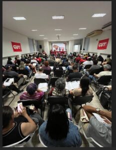 Em 2 dias de debates políticos, a CUT-SE reúne 29 sindicatos do Estado de Sergipe Com o tema ‘Novos tempos, novos desafios’, a 17ª Plenária Estadual da CUT-SE teve início na noite da sexta-feira, dia 25/07, na sede do SINDIFISCO/SE, em Aracaju. Através da exibição de vídeo da CUT nacional, foi feita uma homenagem para João Batista Gomes, o Joãozinho. Compuseram a mesa de abertura: Vanessa Ferreira (FETAM/SE), Cleosvalda Santos (MST), Flávia Rodrigues (Dieese), José Cláudio Silva (Ministério do Trabalho), José Fernando (UGT), Elves Vitoriano (ASSIBGE) e Roberto Silva, presidente da CUT-SE. A análise de conjuntura foi construída pelo secretário nacional da Economia Solidária, Admirson Medeiros (Greg), o presidente da CUT-SE, Roberto Silva, e a diretora nacional da CUT, Ivonete Cruz.