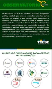 Este jornalista teve a oportunidade de acompanhar no site do TCE o link: observatório. Lá o cidadão e toda imprensa tem um “banquete” de informações disponíveis da gestão estadual e das gestões municipais. Painéis como: obras e serviços; painel de eventos; pacto nacional de retorno das obras na área educacional; mapa da mulher sergipana, emenda parlamentares, receitas e despesas, entre outros.