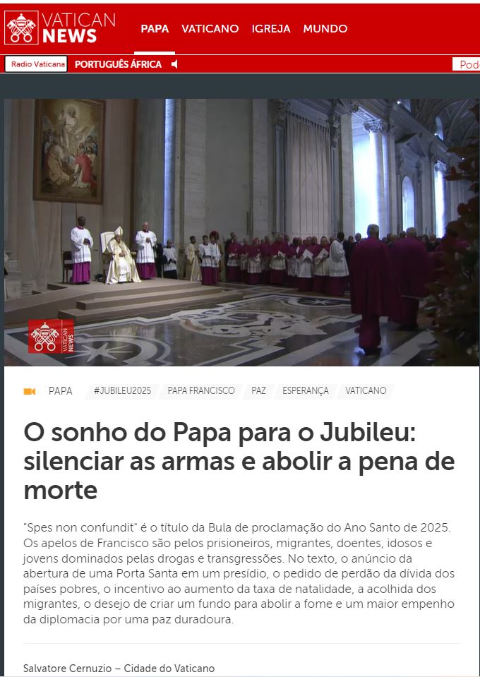 É a esperança que o Papa invoca como dom no Jubileu 2025 para um mundo marcado pelo conflito de armas, morte, destruição, ódio contra o próximo, fome, “dívida ecológica” e baixa taxa de natalidade. A esperança é o bálsamo que Francisco quer derramar sobre as feridas de uma humanidade oprimida pela “brutalidade da violência” ou que se encontra nas garras de um crescimento exponencial da pobreza. “Spes non confundit”, a esperança não decepciona, é o título da Bula de proclamação do Jubileu Ordinário entregue na tarde de hoje, 9 de maio, pelo Papa às Igrejas dos cinco continentes durante as primeiras Vésperas da Solenidade da Ascensão. A Bula, dividida em 25 pontos, contém súplicas, propostas, apelos em favor dos presos, dos doentes, dos idosos, dos pobres, dos jovens, e anuncia as novidades de um Ano Santo que terá como tema “Peregrinos de esperança”. Aqui: https://www.vaticannews.va/pt/papa/news/2024-05/bula-de-proclamacao-do-jubileu-2025-09-05-24.html
