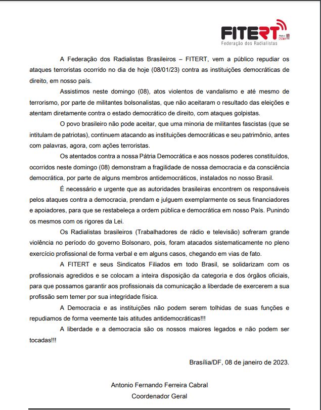Democracia é soberana O governador de Sergipe, Fábio Mitidieri, através do twitter se manifestou contra o ato terrorista de ontem em Brasília: “A democracia é soberana e devemos sempre defendê-la. A escolha do povo nas urnas precisa ser respeitada e honrada. Lamentamos e repudiamos quaisquer atos que atentem contra o Estado Democrático de Direito e nossas Instituições, como os que ocorrem em Brasília. O Brasil precisa de paz, equilíbrio e, sobretudo, olhar para frente e construir um futuro mais justo para todos os brasileiros e brasileiras.”