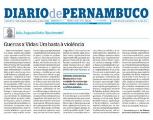 O jornalista David Leite destacou ontem e o blog republica: “Texto do sergipano João Augusto Botto Nascimento publicado nesta quarta-feira na edição impressa do Diário de Pernambuco, o jornal mais antigo em circulação na América Latina, no qual o secretário-geral do Fórum Brasileiro de Direito Humanos faz um apelo pela paz, em meio aos conflitos bélicos que afetam a civilização humana em várias partes do mundo neste exato momento, com perdas expressivas de vidas humanas.”