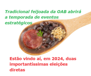 Neste sábado, 21, a Ordem dos Advogados (SE) realiza a sua já famosa e concorrida feijoada. Um encontro festivo de advogados e advogadas que, além da sua natureza original de pura e sincera confraternização, também carrega o ambiente com novas e tensas sinalizações políticas. Estão vindo aí, em 2024, duas importantíssimas eleições diretas. Uma para a renovação da diretoria seccional e outra para a composição da lista sêxtupla dos candidatos da advocacia ao cargo de desembargador do estado.