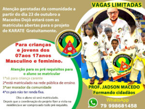 CBKO poderá realizar campeonato brasileiro em Aracaju Já o professor e carateca Jadson Macedo, informou pelas redes sociais, que esteve com o proprietário do Colégio Purificação, Joaquim Macedo, primo dele, que colocou à disposição o ginásio do colégio para sedir o Campeonato Brasileiro de Karatê CBKO, que deve ser realizado em Aracaju no próximo ano. A Macedo Dojô está com as matriculas abertas para o projeto karatê gratuitamente – a partir do dia 23 de outubro – para crianças e jovens dos 7 aos 17 anos, na região do Bairro Santos Dumont e adjacências. Veja no print ao lado mais informações.