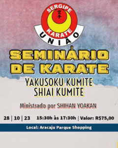 Seminário de Karatê Yakusoku Kumite – Shiai Kumite O Clube Karatê União de Sergipe mais uma vez propicia para os amantes do karatê em Sergipe um evento único: o Seminário de Karatê Yakusoku – Shiai Kumite, ministrado por Shian Yoakan no próximo dia 28, um sábado, das 15h30 às 17h30, no Aracaju Parque Shopping, no valor de R$ 75,00, até o dia 25. O Clube explica que é uma oportunidade única de troca experiência com um mestre de renome internacional que poderá ajudar na evolução do karatê sergipano. O seminário tem o apoio das óticas Carol e da Infonet, através deste pequeno espaço.